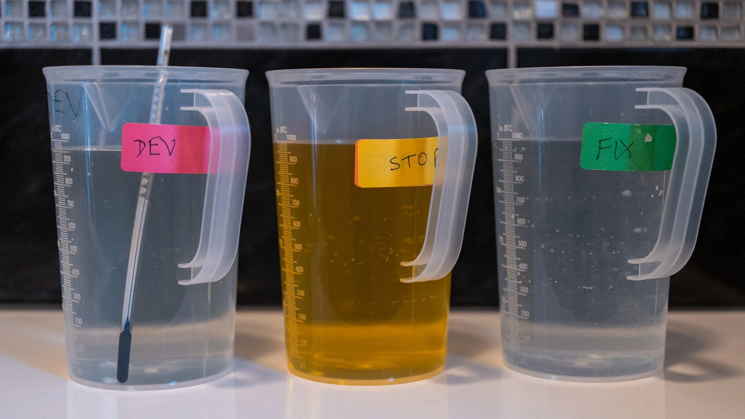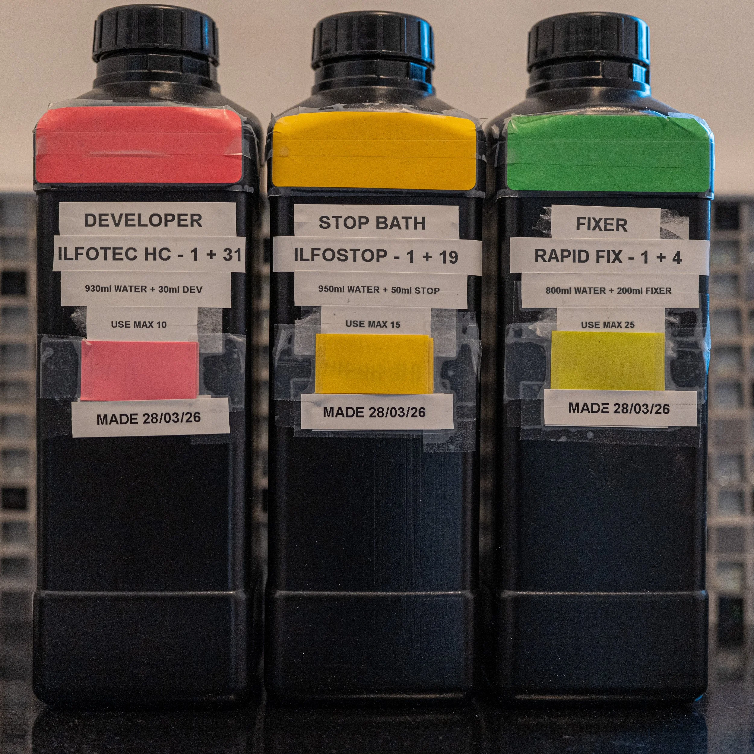It’s a new start, new year, so I mixed up a complete new set of fresh chemistry. I use Ilfotec-HC developer in the main, and I also use Ilford Stop bath and Ilford Rapid Fixer.